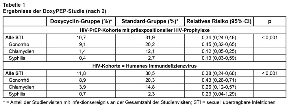 Eine kürzlich im N. Engl. J. Med. publizierte randomisierte kontrollierte Studie ergab eine deutliche Wirksamkeit einer antibiotischen postexpositionellen Prophylaxe (PEP) mit Doxycyclin gegen STI [2]. Die DoxyPEP-Studie wurde an vier US-amerikanischen STI- bzw. HIV-Ambulanzen in San Francisco und Seattle durchgeführt. Die PEP bestand in der Einnahme von 200 mg Doxycyclin innerhalb von 72 Stunden nach jedem kondomlosen Sexualverkehr, die Kontrolle in einer Standardbehandlung (ohne Doxycyclin-Prophylaxe; gegebenenfalls STI-Therapie nach lokalen Leitlinien); die Randomisierung erfolgte 2:1 und war nicht verblindet („open label“). Die Studienpopulation bestand aus 501 Hochrisikopersonen für STI (mittleres Alter 36 Jahre; 96% homosexuelle Männer; 4% Trans-Frauen oder „Gender-Divers“ = Personen, die intergeschlechtlich, transgeschlechtlich oder nicht-binär sind), die entsprechend den Einschlusskriterien entweder Anwender einer HIV-PrEP waren („HIV-PrEP-Kohorte“; n = 432) oder mit einer bekannten HIV-Infektion lebten („HIV-Kohorte“; n = 209) und im Jahr zuvor eine Gonorrhö, eine Chlamydieninfektion oder eine Syphilis durchgemacht hatten. Primärer Endpunkt war das Auftreten einer dieser drei STI pro Quartal während der Nachbeobachtungszeit von 12 Monaten (Diagnosestellung in den Studienzentren oder außerhalb); im Rahmen von vierteljährlichen Studienvisiten erfolgte ein Screening auf Gonorrhö und Chlamydien mittels PCR sowie auf Syphilis mittels Serologie. Das Risiko für diese Infektionen konnte durch die PEP mit Doxycyclin in beiden Kohorten – somit unabhängig vom HIV-Status – um etwa zwei Drittel im Vergleich zur Standardgruppe gesenkt werden. Mit Ausnahme von Syphilis in der HIV-Kohorte war für alle drei untersuchten STI ein signifikanter Präventionseffekt nachweisbar (s. Tab. 1).