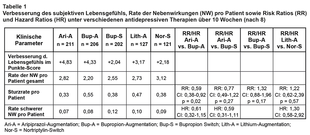 Sturzereignisse: Die Sturzrate war am geringsten unter Ari-Aug mit 0,33 pro Patient, d.h. ein Sturzereignis bei 3 Patienten während der 10 Wochen Therapie; sie war unter Bup-Aug mit 0,55 am höchsten. Auch die als schwerwiegend definierten Ereignisse waren unter Ari-Aug seltener (s. Tab. 1). Die Rate an Nebenwirkungen insgesamt war in allen Kollektiven etwa gleich, aber hoch. Die häufigsten waren Schwindel, gastrointestinale Nebenwirkungen, Mundtrockenheit, Schlaflosigkeit, innere Unruhe und Angst. Eine Akathisie als typische Nebenwirkung von Ari trat bei 11% der Patienten auf.