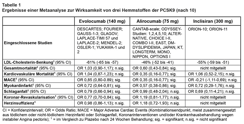Die Ergebnisse der Metaanalyse sind in Tab. 1 wiedergegeben. Demnach ist das Ausmaß der LDL-C-Senkung mit Evolocumab am größten und mit Alirocumab am geringsten. Nur Alirocumab senkt die Gesamt- und die kardiovaskuläre Mortalität. Für Inclisiran existiert kein Nutzennachweis. Evolocumab senkt die Rate an Herzinfarkten, Schlaganfällen und Koronar-Revaskularisationen; dies hat jedoch keine günstigen Auswirkungen auf die kardiovaskuläre Mortalität. Diese schwer erklärliche Diskrepanz war bereits Inhalt heftiger Diskussionen (vgl. [11]).
